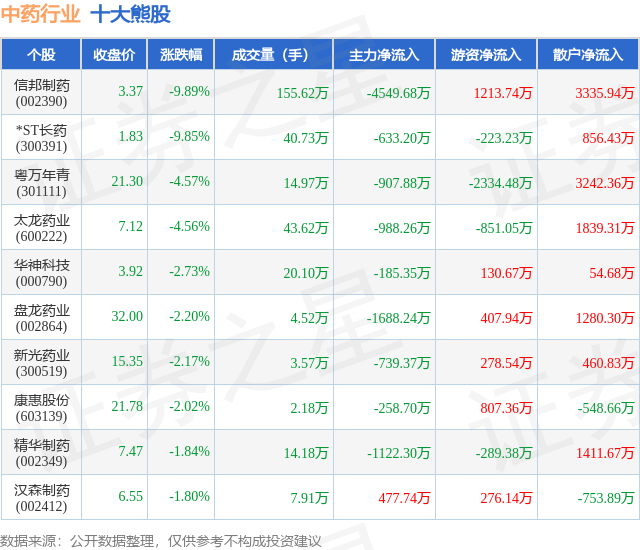 个股表现方面,中药行业当日领跌股为信邦制药(002390),该股当日报收3.37,下跌9.89%,成交量155.62万,主力资金净流出4549.68万元。*ST长药(300391)以下跌9.85%紧随其后,该股当日成交量40.73万,主力资金净流出633.2万元。除此之外,粤万年青(301111)、太龙药业(600222)、华神科技(000790)均进入当日熊股之列。具体个股列表见下表: