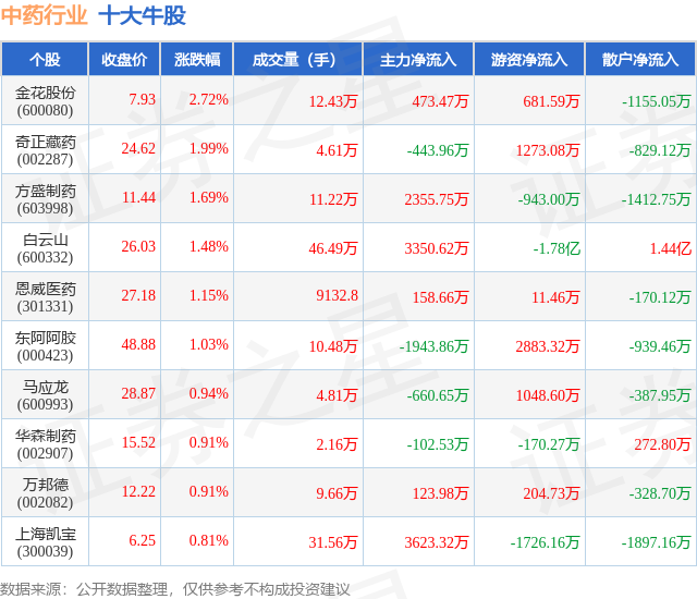 个股表现方面,中药行业当日领涨股为金花股份(600080),该股当日报收7.93,上涨2.72%,成交量12.43万,主力资金净流入473.47万元。奇正藏药(002287)以上涨1.99%紧随其后,该股当日成交量4.61万,主力资金净流出443.96万元。除此之外,方盛制药(603998)、白云山(600332)、恩威医药(301331)均进入当日牛股之列。具体个股列表见下表: