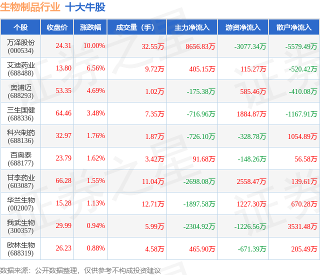 个股表现方面,生物制品行业当日领涨股为万泽股份(000534),该股当日报收24.31,上涨10.0%,成交量32.55万,主力资金净流入8656.83万元。艾迪药业(688488)以上涨6.56%紧随其后,该股当日成交量9.72万,主力资金净流入405.15万元。除此之外,奥浦迈(688293)、三生国健(688336)、科兴制药(688136)均进入当日牛股之列。具体个股列表见下表: