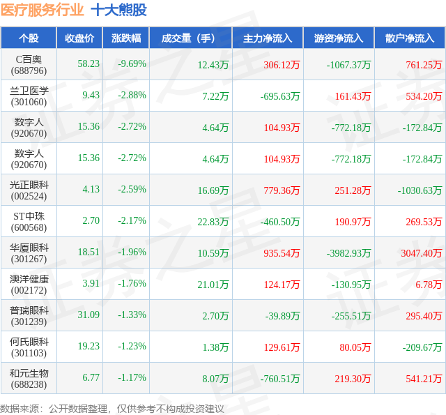 个股表现方面,医疗服务行业当日领跌股为C百奥(688796),该股当日报收58.23,下跌9.69%,成交量12.43万,主力资金净流入306.12万元。兰卫医学(301060)以下跌2.88%紧随其后,该股当日成交量7.22万,主力资金净流出695.63万元。除此之外,数字人(920670)、数字人(920670)、光正眼科(002524)均进入当日熊股之列。具体个股列表见下表: