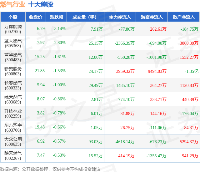 个股表现方面,燃气行业当日领跌股为万憬能源(002700),该股当日报收6.79,下跌3.14%,成交量7.91万,主力资金净流出77.86万元。蓝天燃气(605368)以下跌2.8%紧随其后,该股当日成交量25.15万,主力资金净流出2366.39万元。除此之外,首华燃气(300483)、新奥股份(600803)、长春燃气(600333)均进入当日熊股之列。具体个股列表见下表: