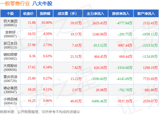 个股表现方面,一般零售行业当日领涨股为百大集团(600865),该股当日报收11.88,上涨10.0%,成交量59.97万,主力资金净流入2625.43万元。全新好(000007)以上涨4.56%紧随其后,该股当日成交量19.57万,主力资金净流入1240.9万元。除此之外,浙江东日(600113)、锦和商管(603682)、大商股份(600694)均进入当日牛股之列。具体个股列表见下表: