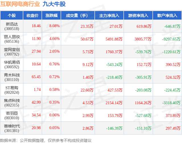 个股表现方面,互联网电商行业当日领涨股为新迅达(300518),该股当日报收18.46,上涨8.08%,成交量23.35万,主力资金净流入27.01万元。丽人丽妆(605136)以上涨4.66%紧随其后,该股当日成交量50.67万,主力资金净流入5491.88万元。除此之外,壹网壹创(300792)、华凯易佰(300592)、青木科技(301110)均进入当日牛股之列。具体个股列表见下表: