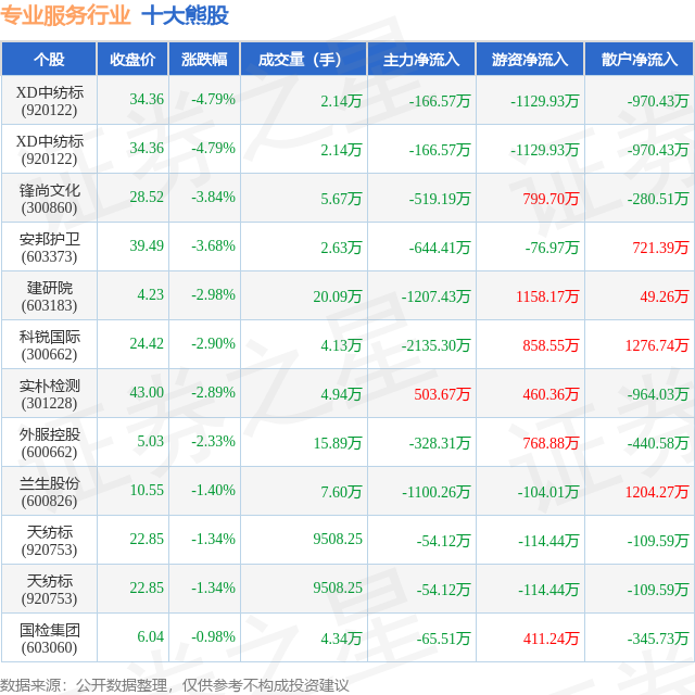 个股表现方面,专业服务行业当日领跌股为XD中纺标(920122),该股当日报收34.36,下跌4.79%,成交量2.14万,主力资金净流出166.57万元。XD中纺标(920122)以下跌4.79%紧随其后,该股当日成交量2.14万,主力资金净流出166.57万元。除此之外,锋尚文化(300860)、安邦护卫(603373)、建研院(603183)均进入当日熊股之列。具体个股列表见下表: