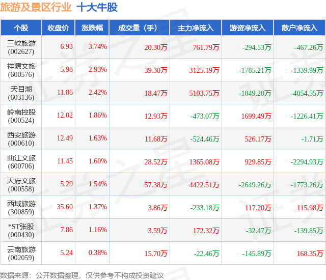 个股表现方面,旅游及景区行业当日领涨股为三峡旅游(002627),该股当日报收6.93,上涨3.74%,成交量20.3万,主力资金净流入761.79万元。祥源文旅(600576)以上涨2.93%紧随其后,该股当日成交量39.3万,主力资金净流入3125.19万元。除此之外,天目湖(603136)、岭南控股(000524)、西安旅游(000610)均进入当日牛股之列。具体个股列表见下表: