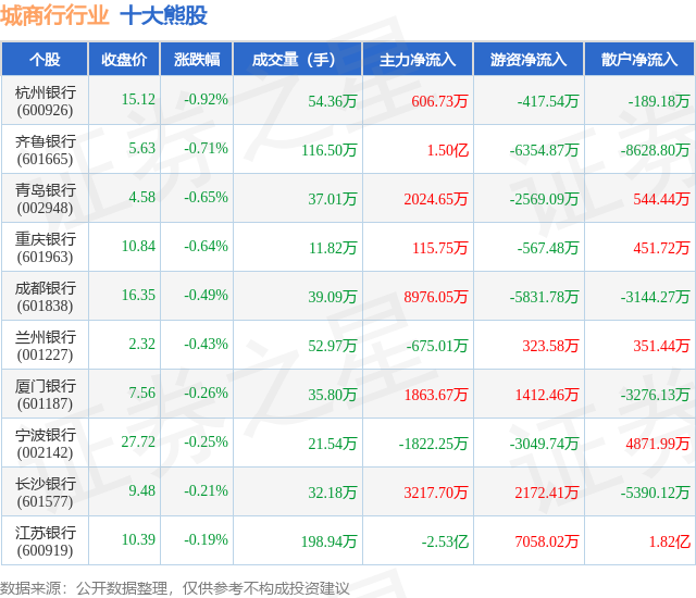 个股表现方面,城商行行业当日领跌股为杭州银行(600926),该股当日报收15.12,下跌0.92%,成交量54.36万,主力资金净流入606.73万元。齐鲁银行(601665)以下跌0.71%紧随其后,该股当日成交量116.5万,主力资金净流入1.5亿元。除此之外,青岛银行(002948)、重庆银行(601963)、成都银行(601838)均进入当日熊股之列。具体个股列表见下表: