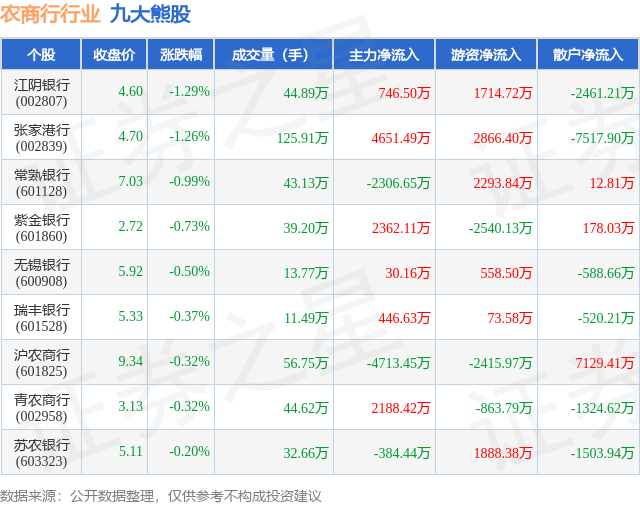 个股表现方面,农商行行业当日领跌股为江阴银行(002807),该股当日报收4.6,下跌1.29%,成交量44.89万,主力资金净流入746.5万元。张家港行(002839)以下跌1.26%紧随其后,该股当日成交量125.91万,主力资金净流入4651.49万元。除此之外,常熟银行(601128)、紫金银行(601860)、无锡银行(600908)均进入当日熊股之列。具体个股列表见下表: