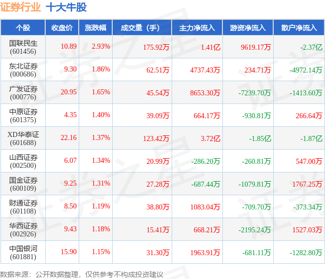个股表现方面,证券行业当日领涨股为国联民生(601456),该股当日报收10.89,上涨2.93%,成交量175.92万,主力资金净流入1.41亿元。东北证券(000686)以上涨1.86%紧随其后,该股当日成交量62.51万,主力资金净流入4737.43万元。除此之外,广发证券(000776)、中原证券(601375)、XD华泰证(601688)均进入当日牛股之列。具体个股列表见下表: