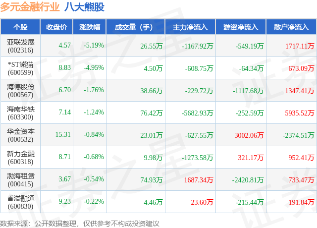 个股表现方面,多元金融行业当日领跌股为亚联发展(002316),该股当日报收4.57,下跌5.19%,成交量26.55万,主力资金净流出1167.92万元。*ST熊猫(600599)以下跌4.95%紧随其后,该股当日成交量4.5万,主力资金净流出608.75万元。除此之外,海德股份(000567)、海南华铁(603300)、华金资本(000532)均进入当日熊股之列。具体个股列表见下表: