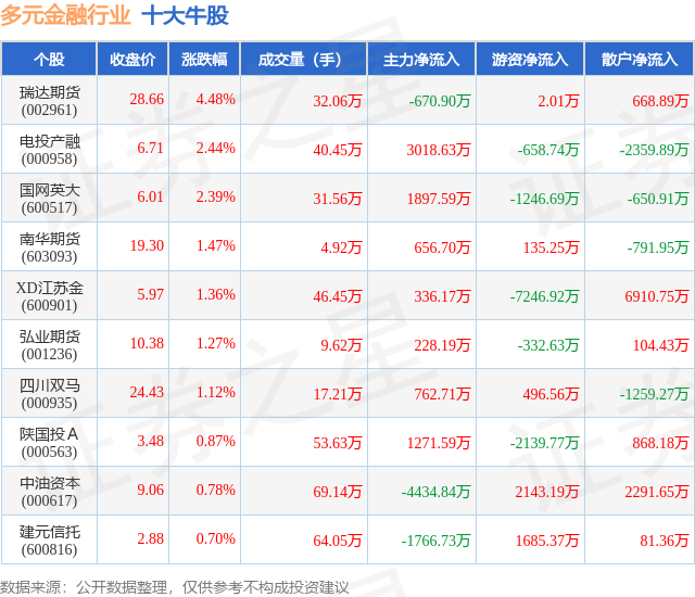 个股表现方面,多元金融行业当日领涨股为瑞达期货(002961),该股当日报收28.66,上涨4.48%,成交量32.06万,主力资金净流出670.9万元。电投产融(000958)以上涨2.44%紧随其后,该股当日成交量40.45万,主力资金净流入3018.63万元。除此之外,国网英大(600517)、南华期货(603093)、XD江苏金(600901)均进入当日牛股之列。具体个股列表见下表: