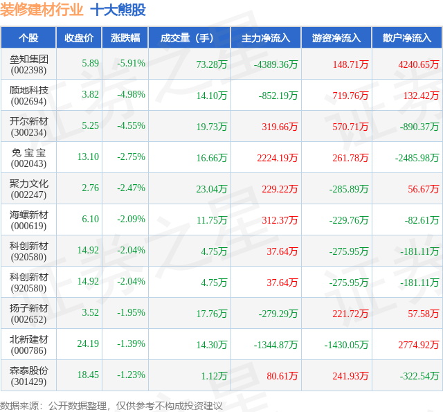 个股表现方面,装修建材行业当日领跌股为垒知集团(002398),该股当日报收5.89,下跌5.91%,成交量73.28万,主力资金净流出4389.36万元。顾地科技(002694)以下跌4.98%紧随其后,该股当日成交量14.1万,主力资金净流出852.19万元。除此之外,开尔新材(300234)、兔 宝 宝(002043)、聚力文化(002247)均进入当日熊股之列。具体个股列表见下表: