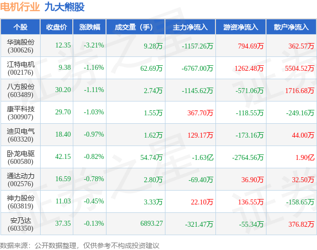 个股表现方面,电机行业当日领跌股为华瑞股份(300626),该股当日报收12.35,下跌3.21%,成交量9.28万,主力资金净流出1157.26万元。江特电机(002176)以下跌1.16%紧随其后,该股当日成交量62.69万,主力资金净流出6767.0万元。除此之外,八方股份(603489)、康平科技(300907)、迪贝电气(603320)均进入当日熊股之列。具体个股列表见下表: