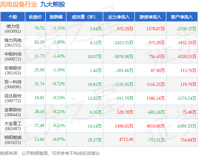 个股表现方面,风电设备行业当日领跌股为德力佳(603092),该股当日报收70.75,下跌3.15%,成交量3.64万,主力资金净流入972.29万元。海力风电(301155)以下跌1.45%紧随其后,该股当日成交量4.12万,主力资金净流出2423.55万元。除此之外,中船科技(600072)、宏德股份(301163)、双一科技(300690)均进入当日熊股之列。具体个股列表见下表: