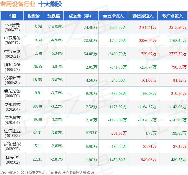 个股表现方面,专用设备行业当日领跌股为*ST新元(300472),该股当日报收8.26,下跌14.58%,成交量24.4万,主力资金净流出4682.27万元。中亚股份(300512)以下跌6.93%紧随其后,该股当日成交量20.5万,主力资金净流出1722.79万元。除此之外,中捷资源(002021)、浙矿股份(300837)、优德精密(300549)均进入当日熊股之列。具体个股列表见下表:
