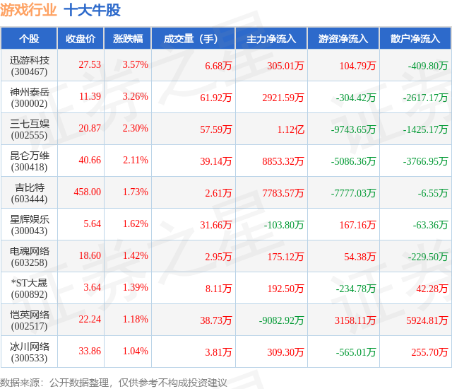 个股表现方面,游戏行业当日领涨股为迅游科技(300467),该股当日报收27.53,上涨3.57%,成交量6.68万,主力资金净流入305.01万元。神州泰岳(300002)以上涨3.26%紧随其后,该股当日成交量61.92万,主力资金净流入2921.59万元。除此之外,三七互娱(002555)、昆仑万维(300418)、吉比特(603444)均进入当日牛股之列。具体个股列表见下表: