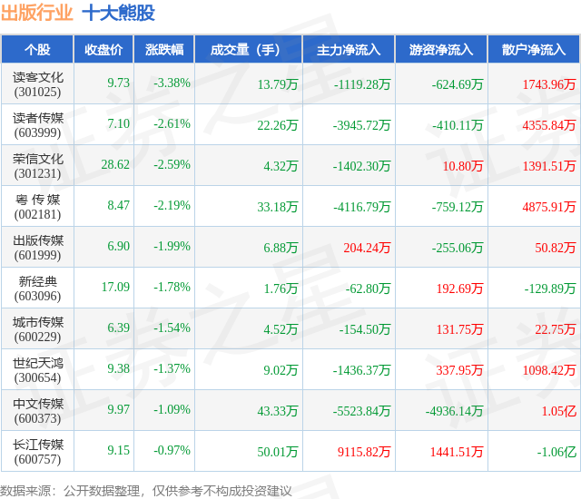 个股表现方面,出版行业当日领跌股为读客文化(301025),该股当日报收9.73,下跌3.38%,成交量13.79万,主力资金净流出1119.28万元。读者传媒(603999)以下跌2.61%紧随其后,该股当日成交量22.26万,主力资金净流出3945.72万元。除此之外,荣信文化(301231)、粤 传 媒(002181)、出版传媒(601999)均进入当日熊股之列。具体个股列表见下表: