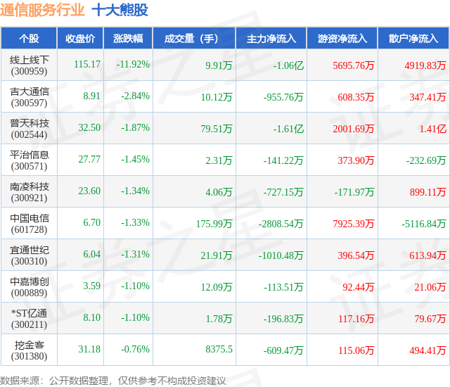 个股表现方面,通信服务行业当日领跌股为线上线下(300959),该股当日报收115.17,下跌11.92%,成交量9.91万,主力资金净流出1.06亿元。吉大通信(300597)以下跌2.84%紧随其后,该股当日成交量10.12万,主力资金净流出955.76万元。除此之外,普天科技(002544)、平治信息(300571)、南凌科技(300921)均进入当日熊股之列。具体个股列表见下表: