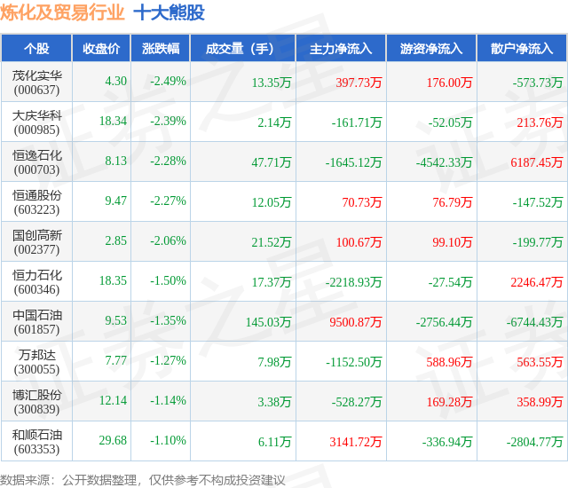 个股表现方面,炼化及贸易行业当日领跌股为茂化实华(000637),该股当日报收4.3,下跌2.49%,成交量13.35万,主力资金净流入397.73万元。大庆华科(000985)以下跌2.39%紧随其后,该股当日成交量2.14万,主力资金净流出161.71万元。除此之外,恒逸石化(000703)、恒通股份(603223)、国创高新(002377)均进入当日熊股之列。具体个股列表见下表: