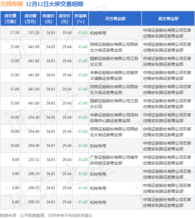 证券之星消息,12月12日无线传媒发生大宗交易,交易数据如下: