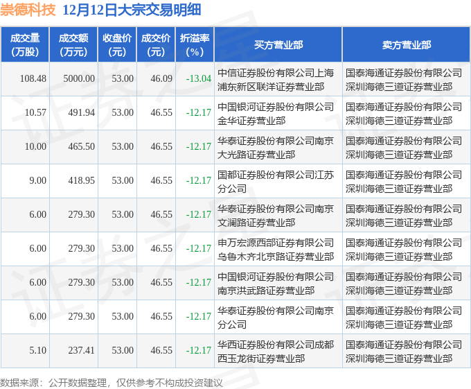 证券之星消息,12月12日崇德科技发生大宗交易,交易数据如下: