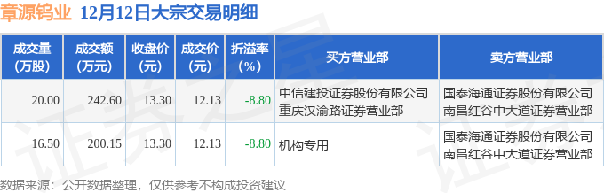 证券之星消息,12月12日章源钨业发生大宗交易,交易数据如下: