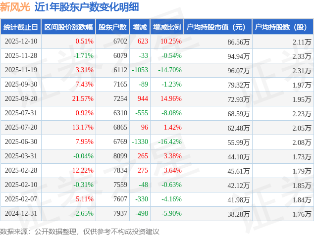 从股价来看,2025年11月28日至2025年12月10日,新风光区间涨幅为0.51%,在此期间股东户数增加623.0户,增幅为10.25%。