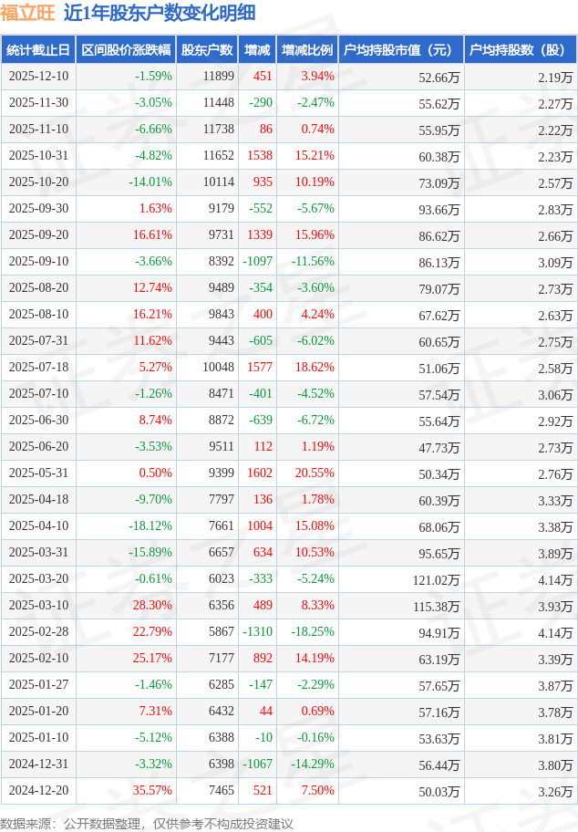 从股价来看,2025年11月30日至2025年12月10日,福立旺区间跌幅为1.59%,在此期间股东户数增加451.0户,增幅为3.94%。