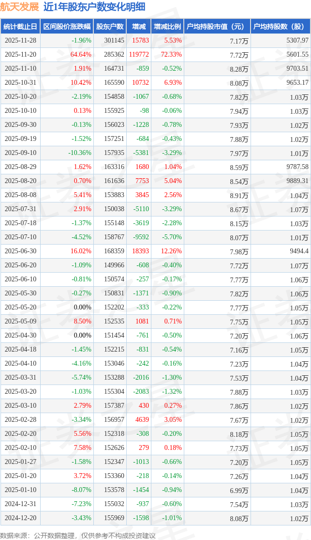 从股价来看,2025年11月20日至2025年11月28日,航天发展区间跌幅为1.96%,在此期间股东户数增加1.58万户,增幅为5.53%。