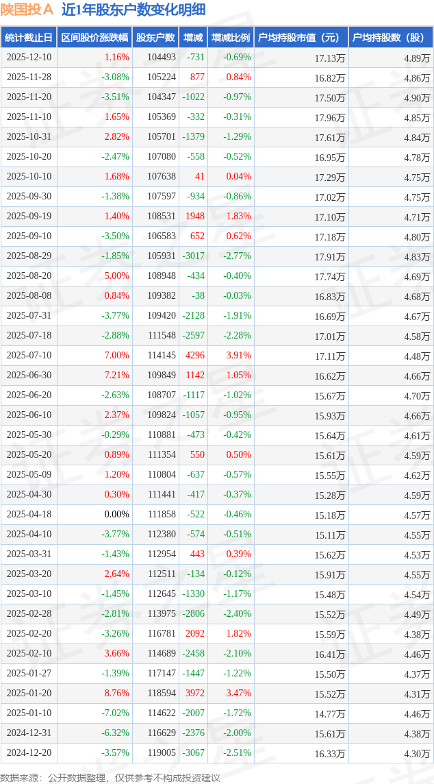 从股价来看,2025年11月28日至2025年12月10日,陕国投A区间涨幅为1.16%,在此期间股东户数减少731.0户,减幅为0.69%。