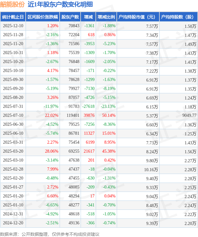 从股价来看,2025年11月28日至2025年12月10日,韶能股份区间涨幅为1.2%,在此期间股东户数减少1361.0户,减幅为1.88%。