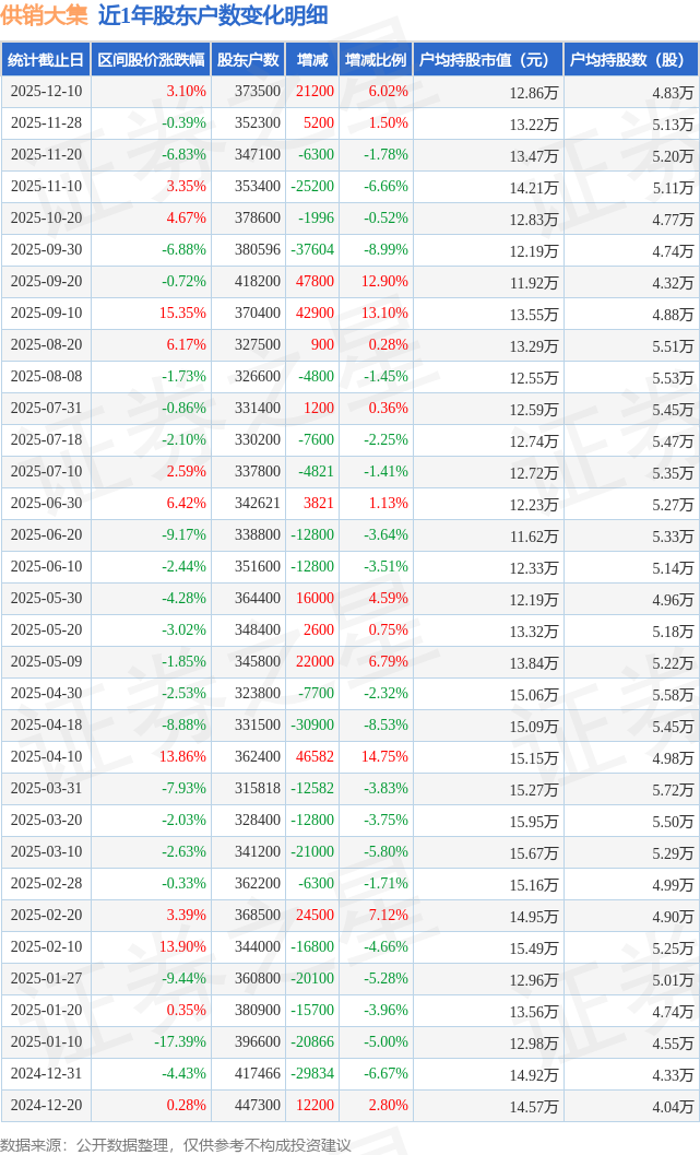 从股价来看,2025年11月28日至2025年12月10日,供销大集区间涨幅为3.1%,在此期间股东户数增加2.12万户,增幅为6.02%。