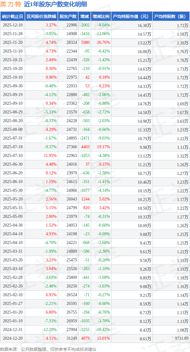 证券之星消息,近日英 力 特披露,截至2025年12月10日公司股东户数为2.29万户,较11月28日减少2002.0户,减幅为8.04%。户均持股数量由上期的1.58万股增加至1.72万股,户均持股市值为16.38万元。