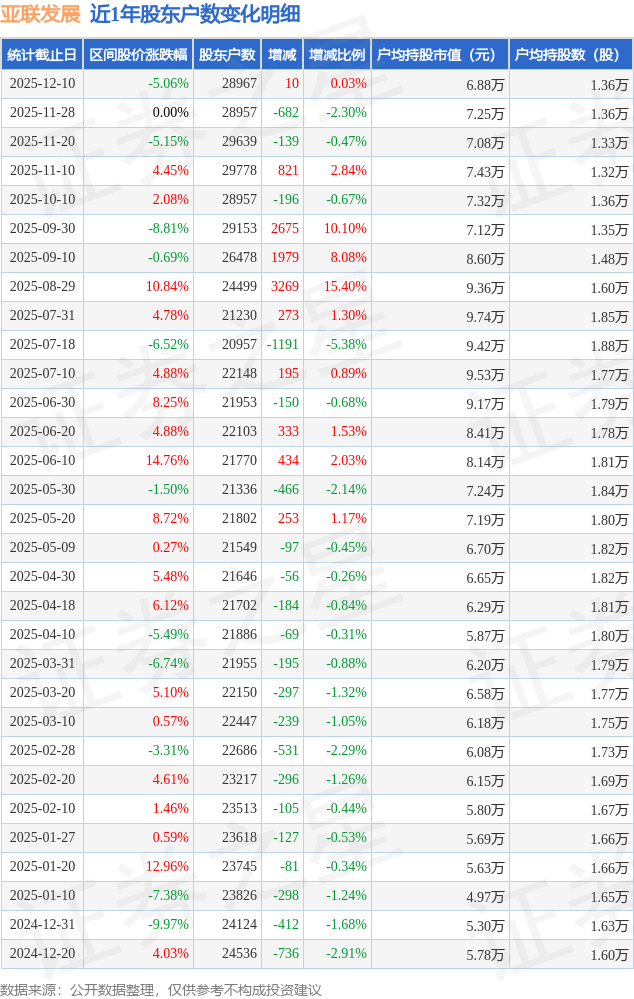 从股价来看,2025年11月28日至2025年12月10日,亚联发展区间跌幅为5.06%,在此期间股东户数增加10.0户,增幅为0.03%。