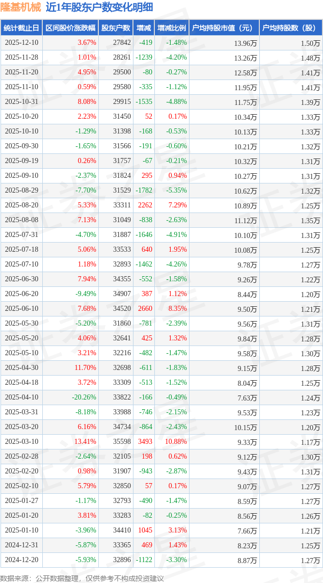 从股价来看,2025年11月30日至2025年12月10日,隆基机械区间涨幅为3.67%,在此期间股东户数减少419.0户,减幅为1.48%。