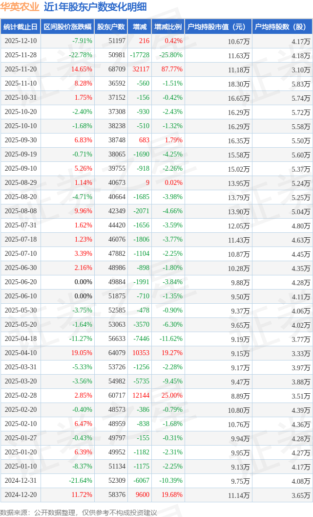 从股价来看,2025年11月28日至2025年12月10日,华英农业区间跌幅为7.91%,在此期间股东户数增加216.0户,增幅为0.42%。