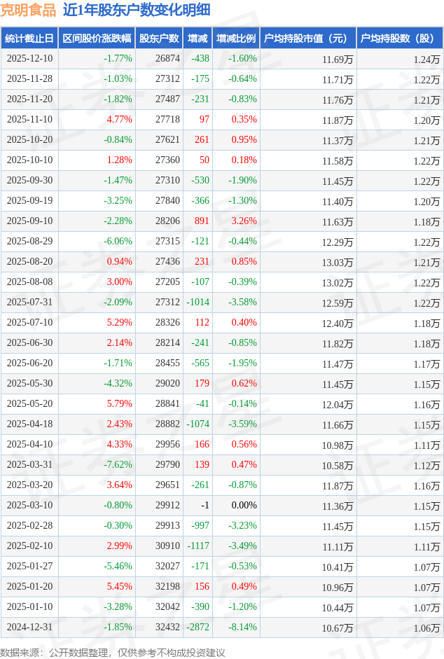 从股价来看,2025年11月28日至2025年12月10日,克明食品区间跌幅为1.77%,在此期间股东户数减少438.0户,减幅为1.6%。