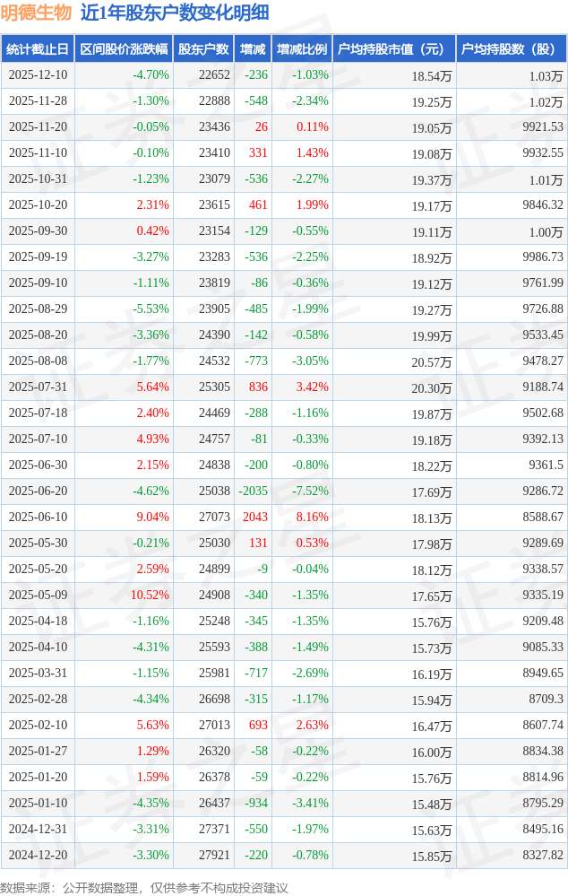 从股价来看,2025年11月28日至2025年12月10日,明德生物区间跌幅为4.7%,在此期间股东户数减少236.0户,减幅为1.03%。