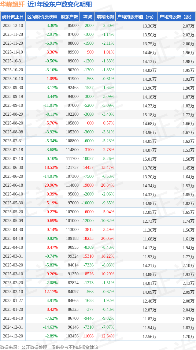 从股价来看,2025年11月28日至2025年12月10日,华峰超纤区间跌幅为3.3%,在此期间股东户数减少2000.0户,减幅为2.3%。