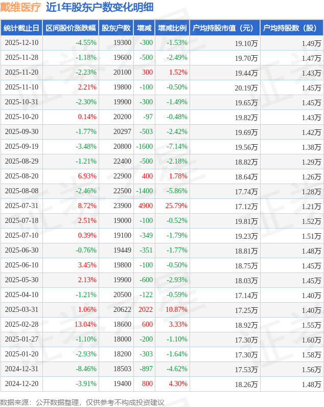 从股价来看,2025年11月28日至2025年12月10日,戴维医疗区间跌幅为4.55%,在此期间股东户数减少300.0户,减幅为1.53%。