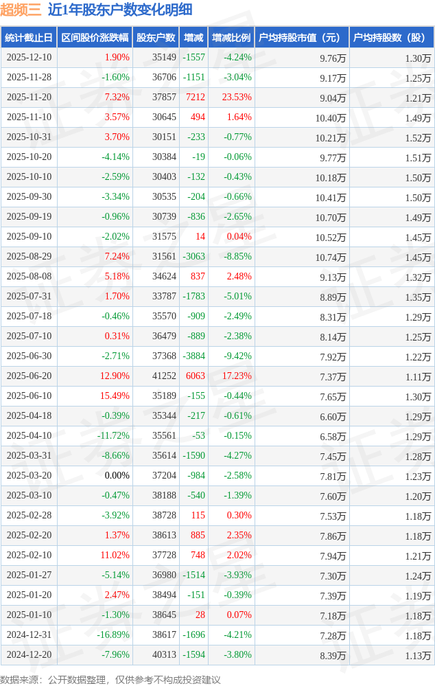 从股价来看,2025年11月28日至2025年12月10日,超频三区间涨幅为1.9%,在此期间股东户数减少1557.0户,减幅为4.24%。