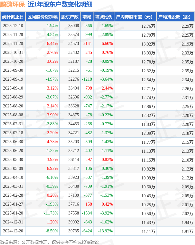 从股价来看,2025年11月28日至2025年12月10日,鹏鹞环保区间跌幅为1.94%,在此期间股东户数减少566.0户,减幅为1.69%。