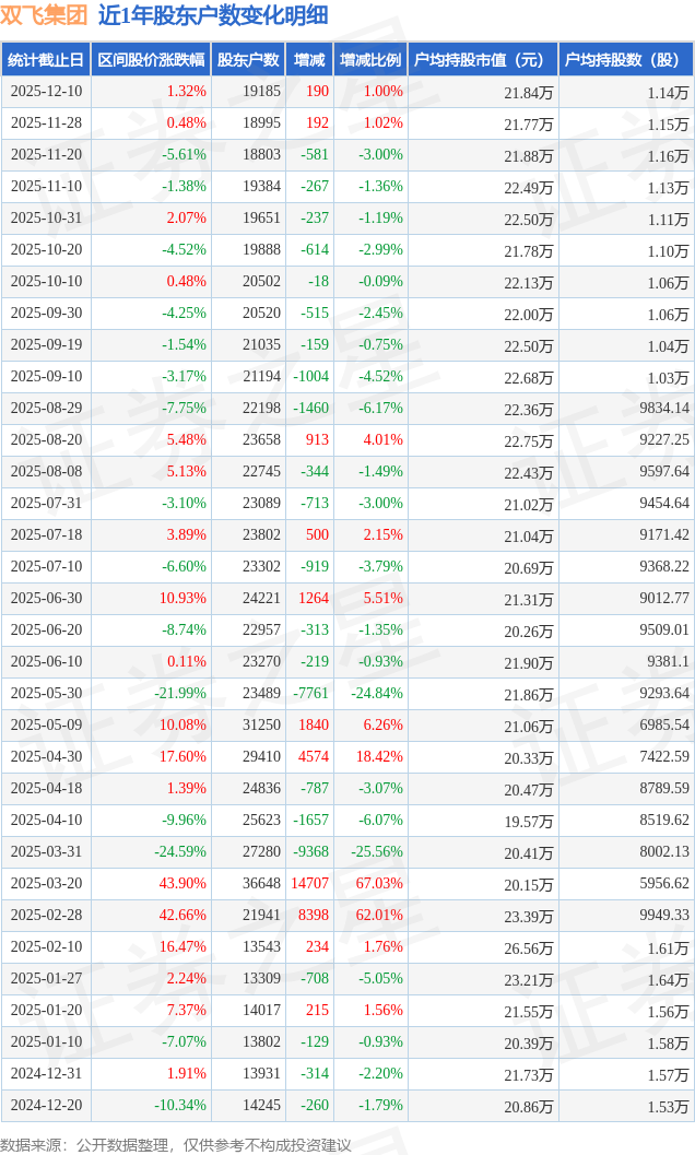从股价来看,2025年11月28日至2025年12月10日,双飞集团区间涨幅为1.32%,在此期间股东户数增加190.0户,增幅为1.0%。