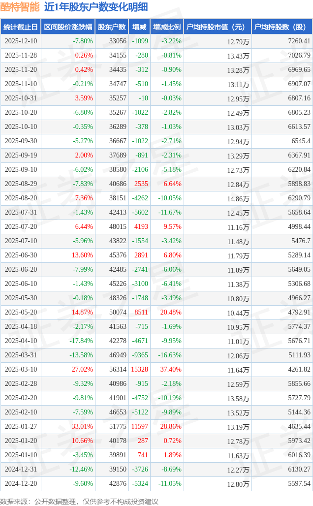 从股价来看,2025年11月28日至2025年12月10日,酷特智能区间跌幅为7.8%,在此期间股东户数减少1099.0户,减幅为3.22%。