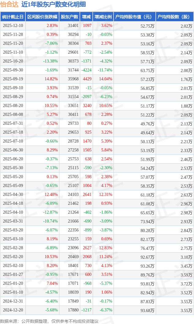 从股价来看,2025年11月20日至2025年12月10日,怡合达区间涨幅为2.83%,在此期间股东户数增加1097.0户,增幅为3.62%。