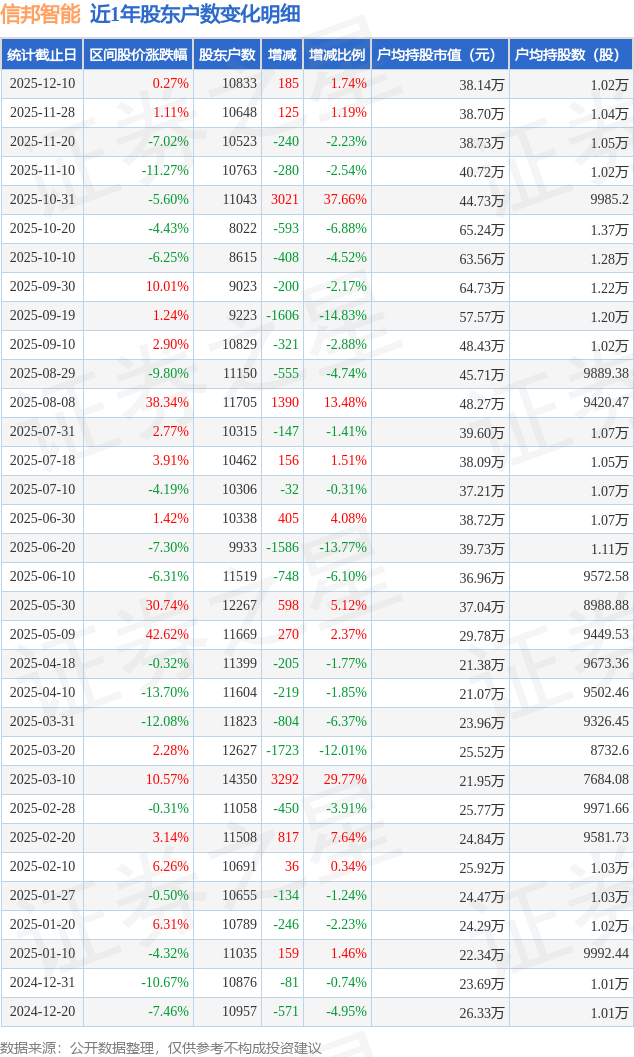证券之星消息,近日信邦智能披露,截至2025年12月10日公司股东户数为1.08万户,较11月28日增加185.0户,增幅为1.74%。户均持股数量由上期的1.04万股减少至1.02万股,户均持股市值为38.14万元。