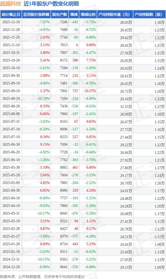从股价来看,2025年11月28日至2025年12月10日,超越科技区间跌幅为7.07%,在此期间股东户数减少442.0户,减幅为5.75%。