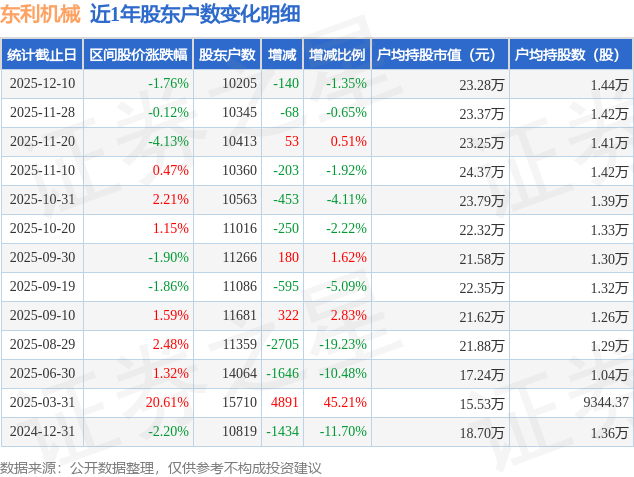 从股价来看,2025年11月28日至2025年12月10日,东利机械区间跌幅为1.76%,在此期间股东户数减少140.0户,减幅为1.35%。