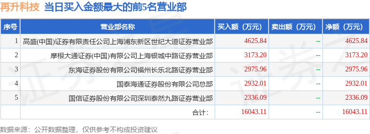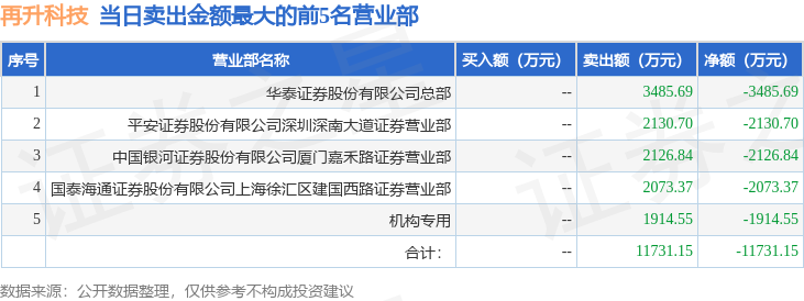 证券之星消息,沪深交易所2025年12月12日公布的交易公开信息显示,再升科技(603601)因有价格涨跌幅限制的日收盘价格涨幅偏离值达到7%的前五只证券登上龙虎榜。此次是近5个交易日内第3次上榜。