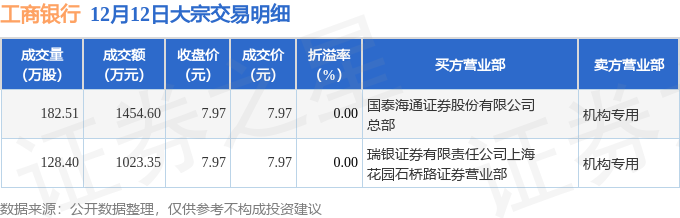 证券之星消息,12月12日工商银行发生大宗交易,交易数据如下: