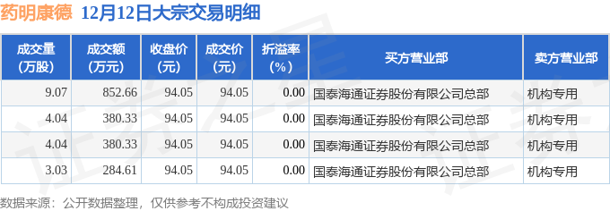 证券之星消息,12月12日药明康德发生大宗交易,交易数据如下: